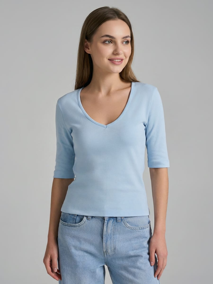 Женский лонгслив от бренда ТВОЕ — это стильная и универсальная вещь, которая займёт достойное место в гардеробе современной женщины в сезоне 2026. Нежный голубой оттенок смотрится свежо и актуально, добавляя образам лёгкости и изысканности, а также легко сочетается с самыми разными элементами гардероба. Приталенный крой мягко облегает фигуру, подчёркивая её достоинства без излишней стеснённости. Он создаёт элегантный силуэт, который выглядит стильно как в повседневных, так и в нарядных комплектах. Глубокий V‑образный вырез добавляет модели женственности и визуально удлиняет линию шеи, делая образ более утончённым. Рукава длиной 3/4 придают силуэту сбалансированность и делают кофту особенно удачным выбором для межсезонья.