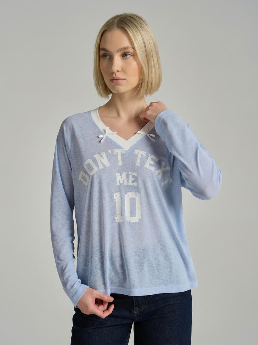 Женский лонгслив от бренда ТВОЕ — это смелый синтез непринуждённого повседневного стиля и выразительной дизайнерской детали, способный подчеркнуть индивидуальность и чувство юмора своей обладательницы. Ключевая изюминка модели — контрастные дизайнерские акценты. Белый V‑образный вырез горловины эффектно оттеняет голубой фон ткани, придавая силуэту графичность и зрительно вытягивая линию шеи. Два небольших бантика на горловине вносят нотку игривой романтичности, смягчая строгость контрастного выреза. А белая надпись «Don’t text me» вместе с цифрой «10» становится ярким коммуникативным элементом, добавляющим образу дерзкий, ироничный подтекст.