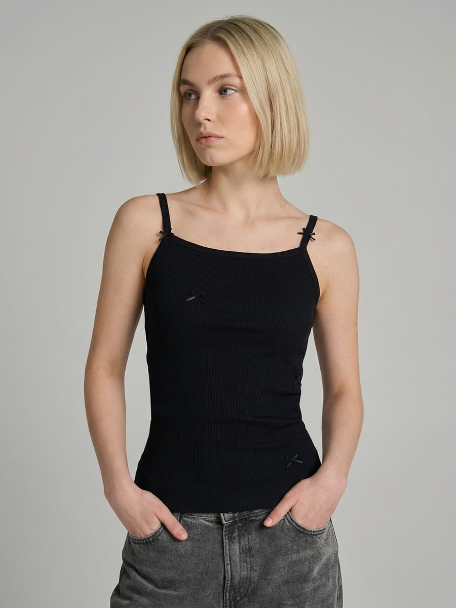 Эта стильная и модная женская майка от бренда ТВОЕ станет настоящей находкой для вашего гардероба. Выполненная из 100% хлопка, кофта обладает рубчиковой фактурой, что придает ей дополнительную эластичность и комфорт. Тонкие лямки и открытые плечи подчёркивают утончённость и женственность модели, делая её идеальной для летних дней. Приталенный крой и облегающий силуэт обеспечивают идеальную посадку, подчёркивая достоинства фигуры. Нежные бантики добавляют образу игривости и шарма, делая кроп-топ подходящим как для подростков, так и для женщин, стремящихся следовать модным тенденциям.