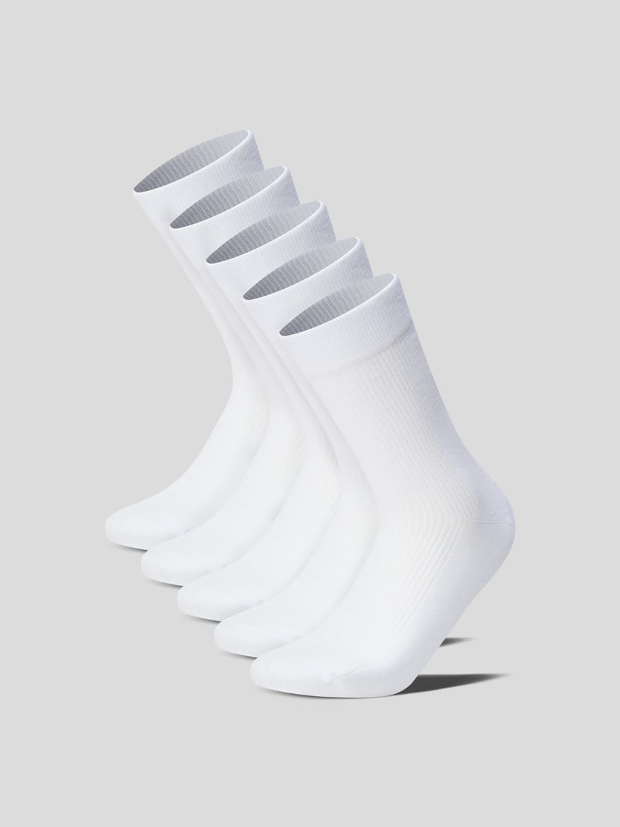Набор мужских носков от ТВОЕ — 5 пар длинных однотонных белых носков для спорта и повседневной носки. Выполнены из мягкой ткани (66 % хлопка, 30 % полиамида, 4 % эластана), подходят для размеров обуви 40–45. Тонкие, удобные и прочные — идеальный базовый набор или практичный подарок для мужчин и подростков!