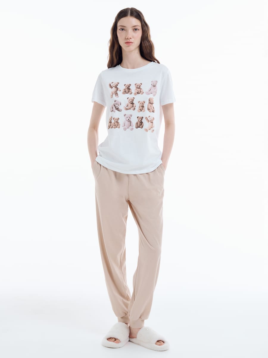 Стильная пижама в нежных тонах состоит из белой футболки с милым принтом плюшевых мишек и бежевых брюк-джоггеров, создавая идеальный баланс между комфортом и стилем.
