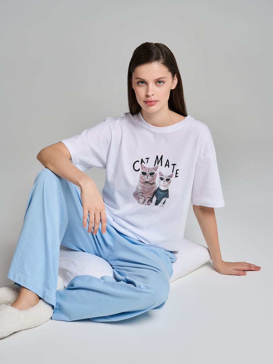 Женская пижама от бренда ТВОЕ — это воплощение домашнего уюта и игривого стиля. Комплект‑двойка состоит из белоснежной футболки с коротким рукавом и широких брюк, создавая идеальный ансамбль для комфортного отдыха. Футболка привлекает внимание очаровательным принтом: милые котики в сочетании с забавной надписью «Cat mate» добавляют образу лёгкости и настроения. Широкие брюки в голубую полоску привносят в комплект нотку ретро‑шарма, делая пижаму не просто домашней одеждой, а стильным элементом повседневного гардероба.