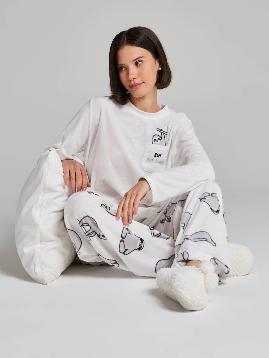 Откройте для себя новый уровень комфорта с очаровательной пижамой от бренда ТВОЕ! Сочетание белого лонгслива с милым патчем ленивца и белых брюк с забавным принтов ленивца создаст неповторимую атмосферу уюта и комфорта в вашем доме.