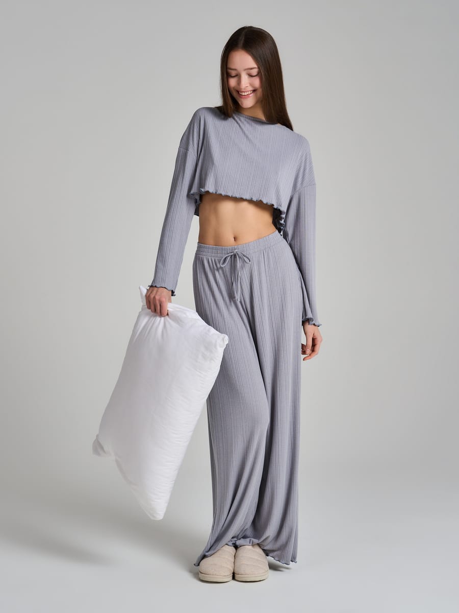 Представляем стильную пижаму от бренда ТВОЕ, идеально подходящую как для женщин, так и для подростков. Этот домашний костюм выполнен из качественного рубчикового материала, включающего полиэстер и вискозу, что обеспечивает мягкость и приятные тактильные ощущения. Комплект состоит из укороченного свободного лонгслива с длинным рукавом и широких прямых брюк на резинке с завязками. Набор представлен в однотонном стиле, что придает ей элегантный и современный вид. Отсутствие карманов добавляет минималистичности и утонченности.