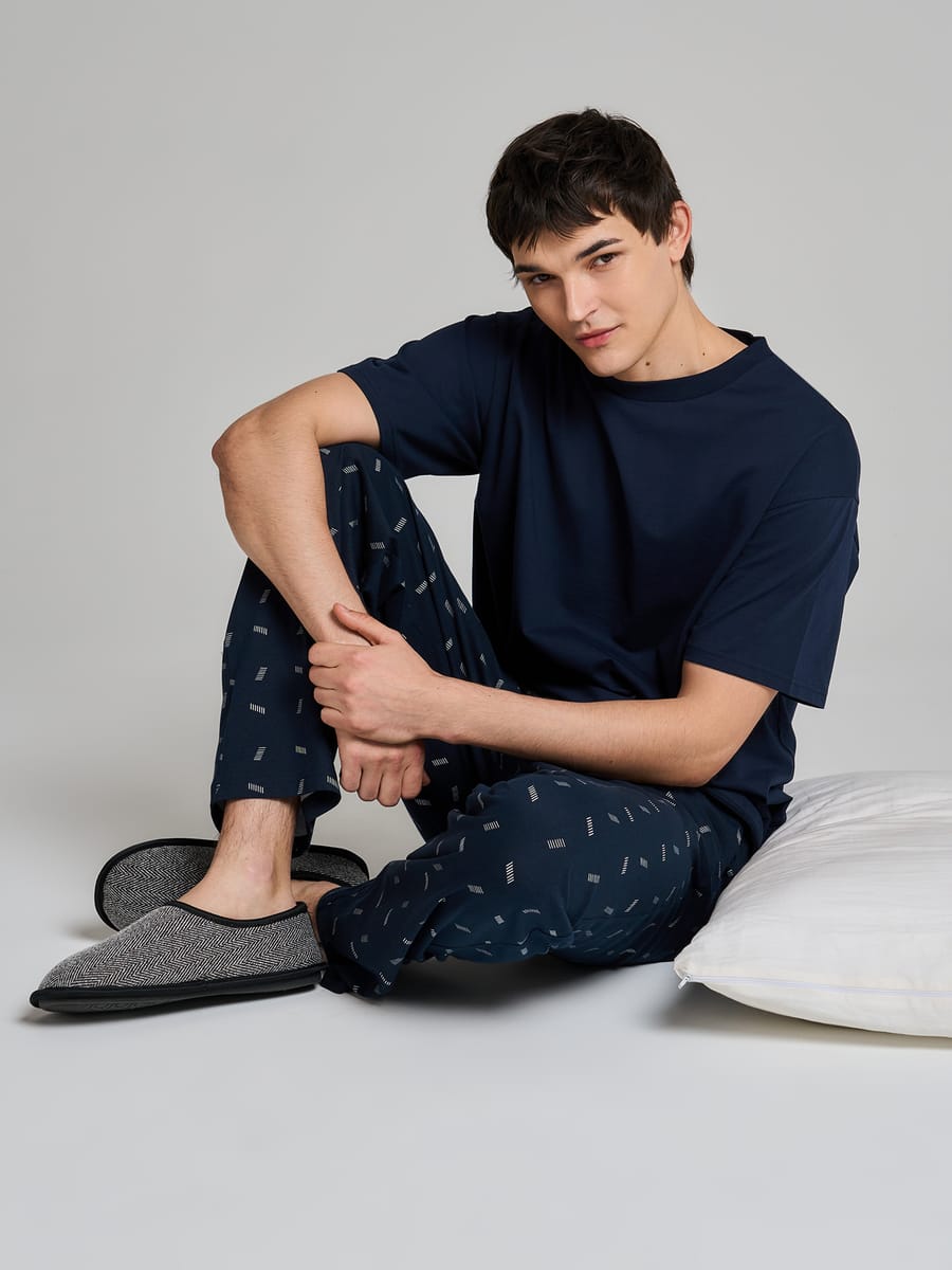 Мужская пижама от бренда ТВОЕ — это сочетание классического стиля и непревзойдённого комфорта для домашнего отдыха. Верхняя часть комплекта — однотонная футболка с коротким рукавом. Лаконичный дизайн подчёркивает чистоту линий и универсальность модели. Глубокий тёмно-синий цвет придаёт образу солидности и элегантности, легко сочетаясь с разными интерьерными решениями. Нижняя часть — прямые брюки на мягкой резинке с изысканным орнаментом в мелкую полоску. Такой принт добавляет комплекту изюминку, не перегружая общий вид.