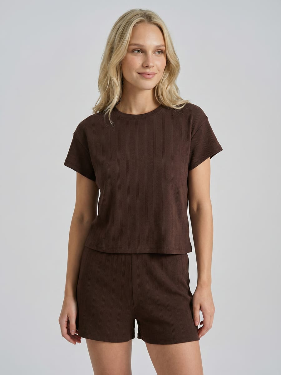 Женская пижама от ТВОЕ 2026 — стильный летний комплект: футболка с коротким рукавом и шорты на резинке в коричневом цвете. Выполнена из мягкой эластичной ткани (хлопок с эластаном) с фактурой с перфорацией. Красивая, милая и удобная — идеальный выбор для сна и домашнего отдыха летом, подойдёт женщинам и подросткам!