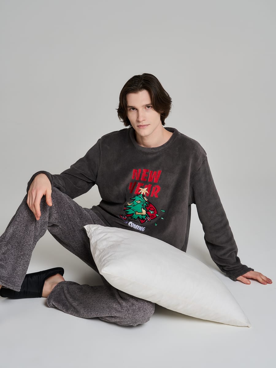 Комплект двойка состоит из лонгслива с длинным рукавом и прямых брюк на мягкой резинке. Модель выполнена в сдержанном сером оттенке, который легко сочетается с любым интерьером и создаёт атмосферу домашнего комфорта. Пижама украшена оригинальной нашивкой: весёлая ёлка, будто убегающая с подарками, добавит новогоднего настроения и сделает ваш домашний образ по настоящему праздничным. Практичные карманы на брюках обеспечивают удобство в повседневном использовании.