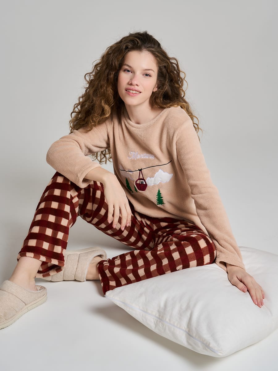 Откройте для себя мир безмятежного комфорта с новой пижамой от бренда ТВОЕ — идеальным спутником для уютных домашних вечеров и спокойного сна.Комплект состоит из лонгслива бежевого цвета с изысканной вышивкой: живописная кабинка на канатной дороге и стильная надпись Montana и прямых брюк в элегантной бежево-коричневой клетке, создающей тёплый природный акцент. Это не просто домашняя одежда — это приглашение в атмосферу горного отдыха и безмятежности. Мягкое плюшевое полотно дарит ощущение тепла, а продуманный дизайн с вышивкой и клетчатым принтом создаёт настроение путешествия даже в стенах дома. Она станет вашей любимой вещью для расслабленных вечеров, чтения книг или чаепитий.