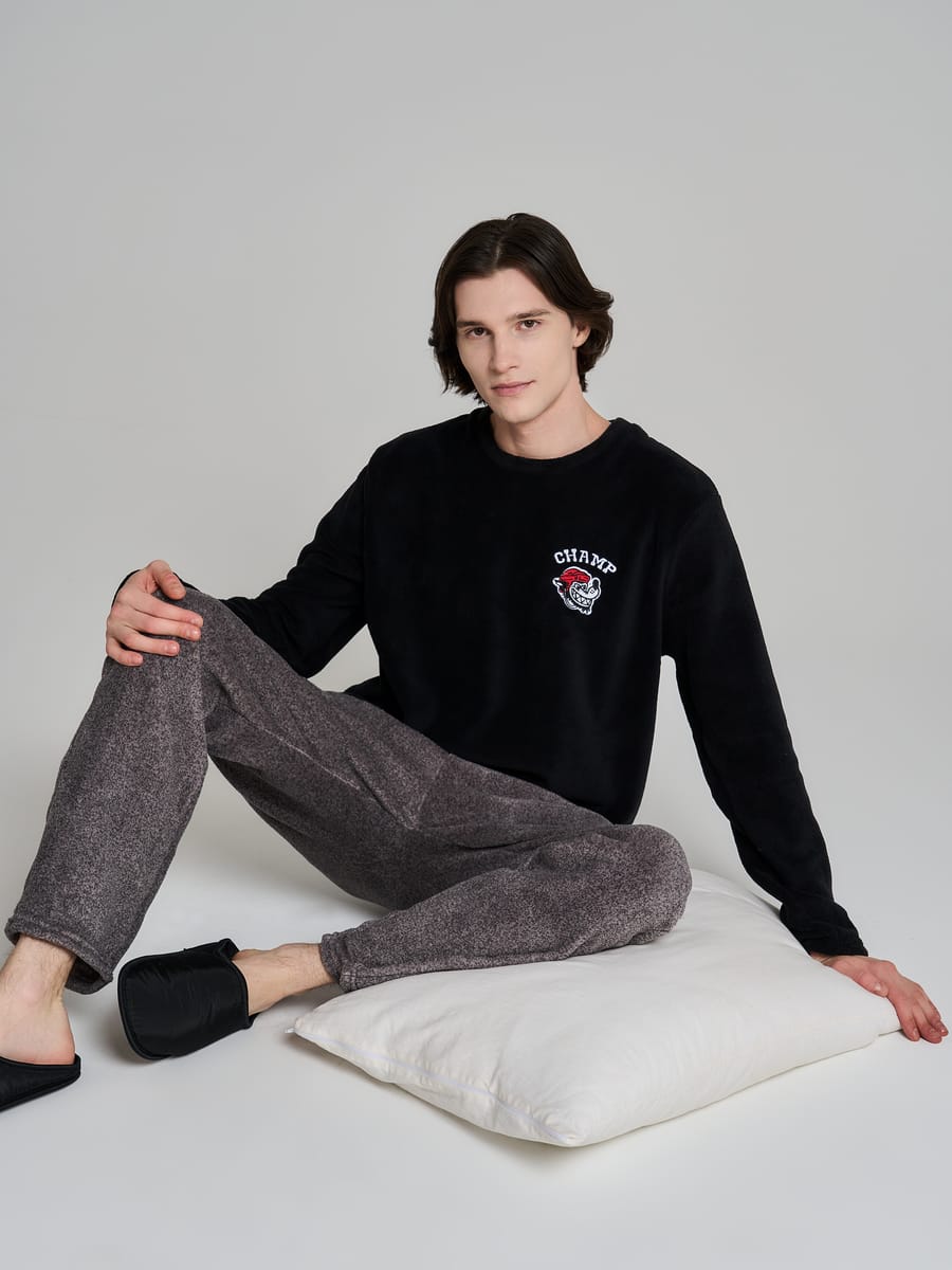 Тёплая мужская пижама от бренда ТВОЕ — уютный и стильный комплект для домашнего отдыха. Модель выполнена в формате двойки: лонгслив с длинным рукавом и прямые брюки на мягкой резинке. Плюшевая текстура материала дарит приятные тактильные ощущения и надёжно сохраняет тепло. Дизайн выделяет оригинальная нашивка с изображением волка и надписью Champ — лаконичный акцент, придающий комплекту молодёжный характер. Функциональные карманы на брюках добавляют практичности: в них удобно хранить мелкие предметы.