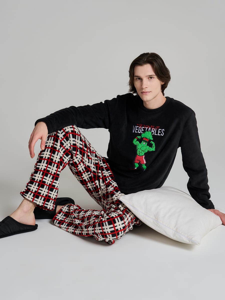 Комфортная пижама двойка в современном стиле — идеальный выбор для домашнего отдыха. Комплект объединяет практичность, мягкость материала и оригинальный дизайн с тематической графикой. Лонгслив выполнен в глубоком чёрном цвете и украшен яркой нашивкой с изображением брокколи и надписью The power of vegetables — игривый акцент, подчёркивающий молодёжный характер модели. Брюки в клетку добавляют комплекту стилистическую выразительность и визуально разнообразят монохромный верх.