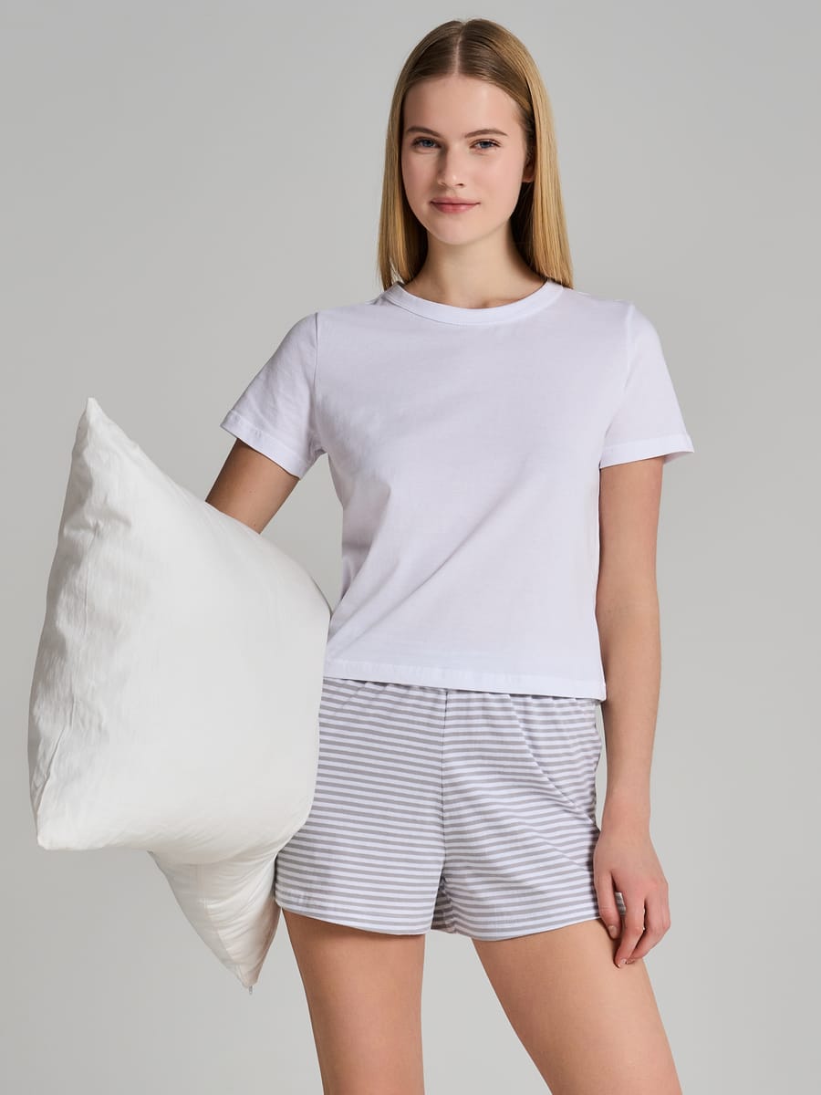 Женская пижама от бренда ТВОЕ — это гармоничное сочетание непринуждённого стиля и абсолютного комфорта для домашнего отдыха. Комплект-двойка состоит из элегантной однотонной футболки белоснежного оттенка и коротких шорт с изысканной полоской. Лаконичная футболка с коротким рукавом придаёт образу свежесть и чистоту, а шорты с деликатным полосатым принтом вносят лёгкую игривость и динамичность, сохраняя при этом ощущение свободы и расслабленности. Выполнена из 100% натурального хлопка, который дарит неповторимые тактильные ощущения: ткань мягко облегает тело, отлично пропускает воздух и позволяет коже дышать. Свободный крой и отсутствие карманов подчёркивают минималистичный дизайн, добавляют изящества силуэту и не сковывают движений.