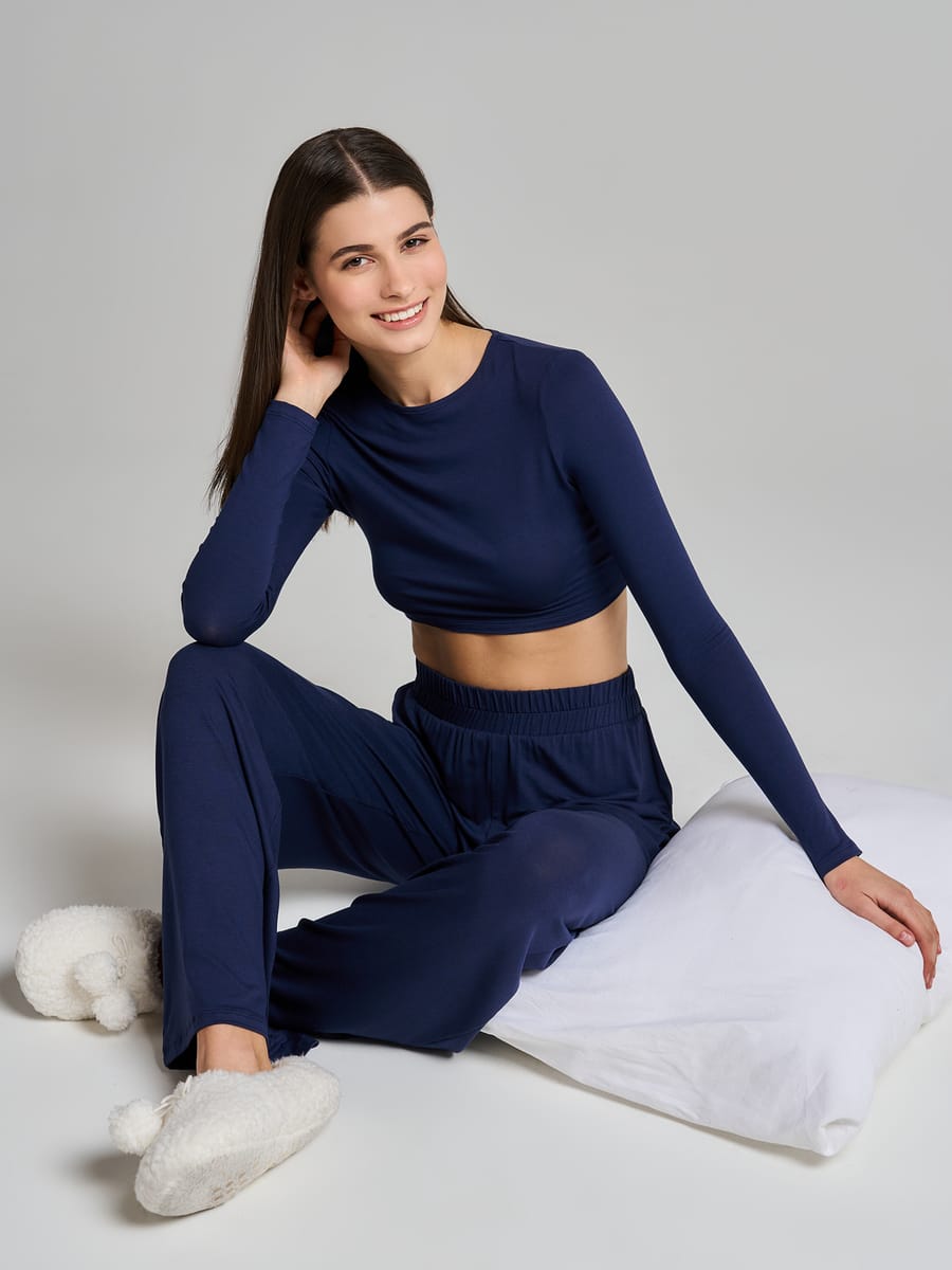 Женская пижама от бренда ТВОЕ — это изысканное сочетание домашнего уюта и современной элегантности. Комплект‑двойка в глубоком тёмно‑синем оттенке выглядит одновременно сдержанно и стильно, превращая повседневную домашнюю одежду в выразительный элемент гардероба. Кроп‑топ с длинным рукавом деликатно подчёркивает линию талии, даря ощущение лёгкости и свободы. Прямые свободные брюки завершают образ, обеспечивая непревзойдённый комфорт и позволяя телу двигаться естественно в любой ситуации — будь то спокойный сон, утренний ритуал или неспешный выходной день.