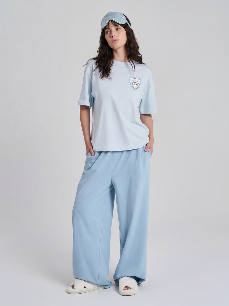 Модная пижама от ТВОЕ 2026 года — идеальный выбор для тех, кто ценит комфорт и стиль даже дома. Комплект‑двойка из 100 % хлопка включает футболку с коротким рукавом, принтом сердца и надписью i literally just want to be in my pjs, а также прямые голубые брюки. Мягкая, стильная и удобная, она подойдёт для сна, отдыха и повседневного домашнего гардероба. Представлена в больших размерах — отличный подарок для девушек, женщин и подростков, которые хотят чувствовать себя уютно и выглядеть модно!