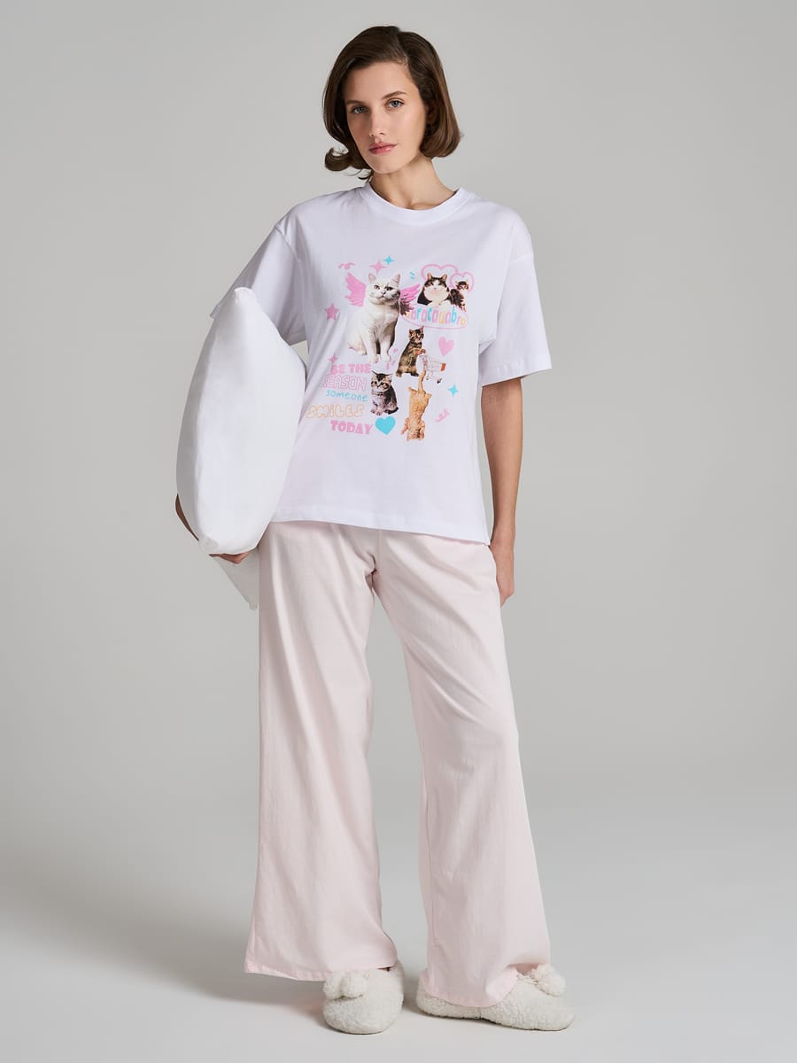 Женская пижама от бренда ТВОЕ — это воплощение уюта и жизнерадостного стиля в домашней одежде. Комплект‑двойка состоит из белоснежной футболки с коротким рукавом и прямых розовых брюк, создавая гармоничное цветовое сочетание, которое поднимает настроение и дарит ощущение лёгкости. Футболка украшена очаровательным принтом с котиком и вдохновляющей надписью be the reason someone smiles today — эти детали придают комплекту особый шарм и позитивный настрой. Выполненная из 100 % хлопка, домашний костюм поражает своей мягкостью и комфортом: натуральная ткань прекрасно дышит, не раздражает кожу и обеспечивает приятные ощущения как во время сна, так и в дневные часы домашнего отдыха.