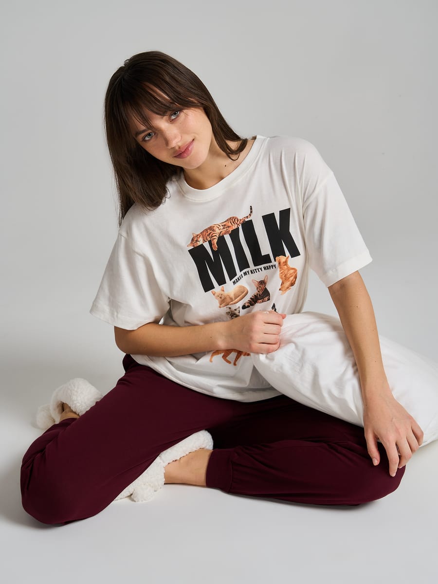 Женская пижама от бренда ТВОЕ - это стильный и уютный комплект для комфортного отдыха в домашней обстановке. Выполненный из 100% мягкого и дышащего хлопка, домашний костюм обеспечивает максимальный комфорт при носке. Белая футболка с забавным принтом котиков и бордовые брюки-джоггеры с карманами создают гармоничный и современный образ. Свободный, но в то же время облегающий силуэт набора для дома не стесняет движений, позволяя чувствовать себя комфортно.