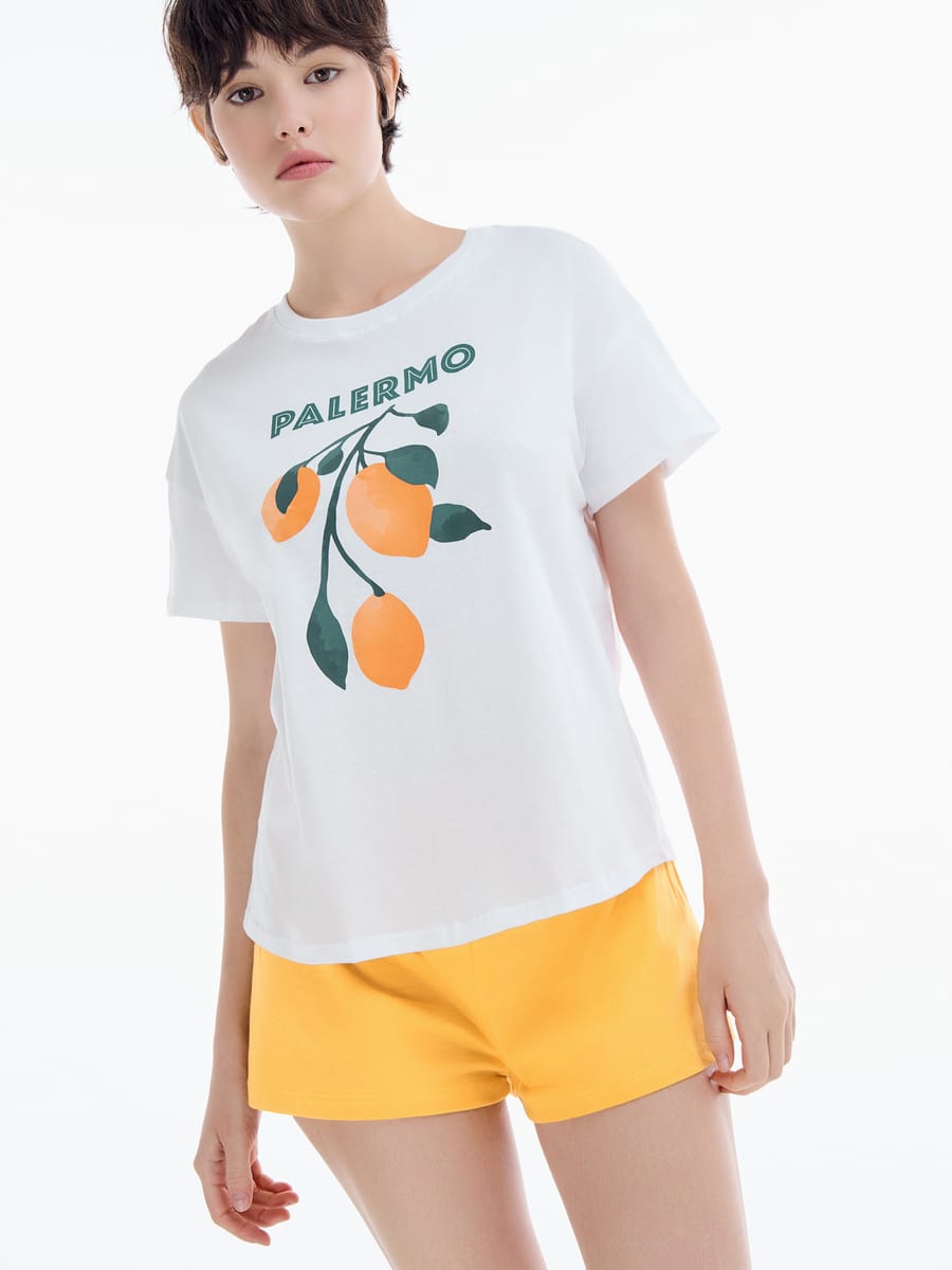 Представляем вашему вниманию стильную пижаму от бренда ТВОЕ — идеальное сочетание комфорта и модного дизайна. Комплект состоит из белой футболки с очаровательным принтом лимонов и надписью Palermo, дополненной желтыми короткими шортами. 100% натуральный хлопок, обеспечивающий приятные тактильные ощущения и отличную воздухопроницаемость