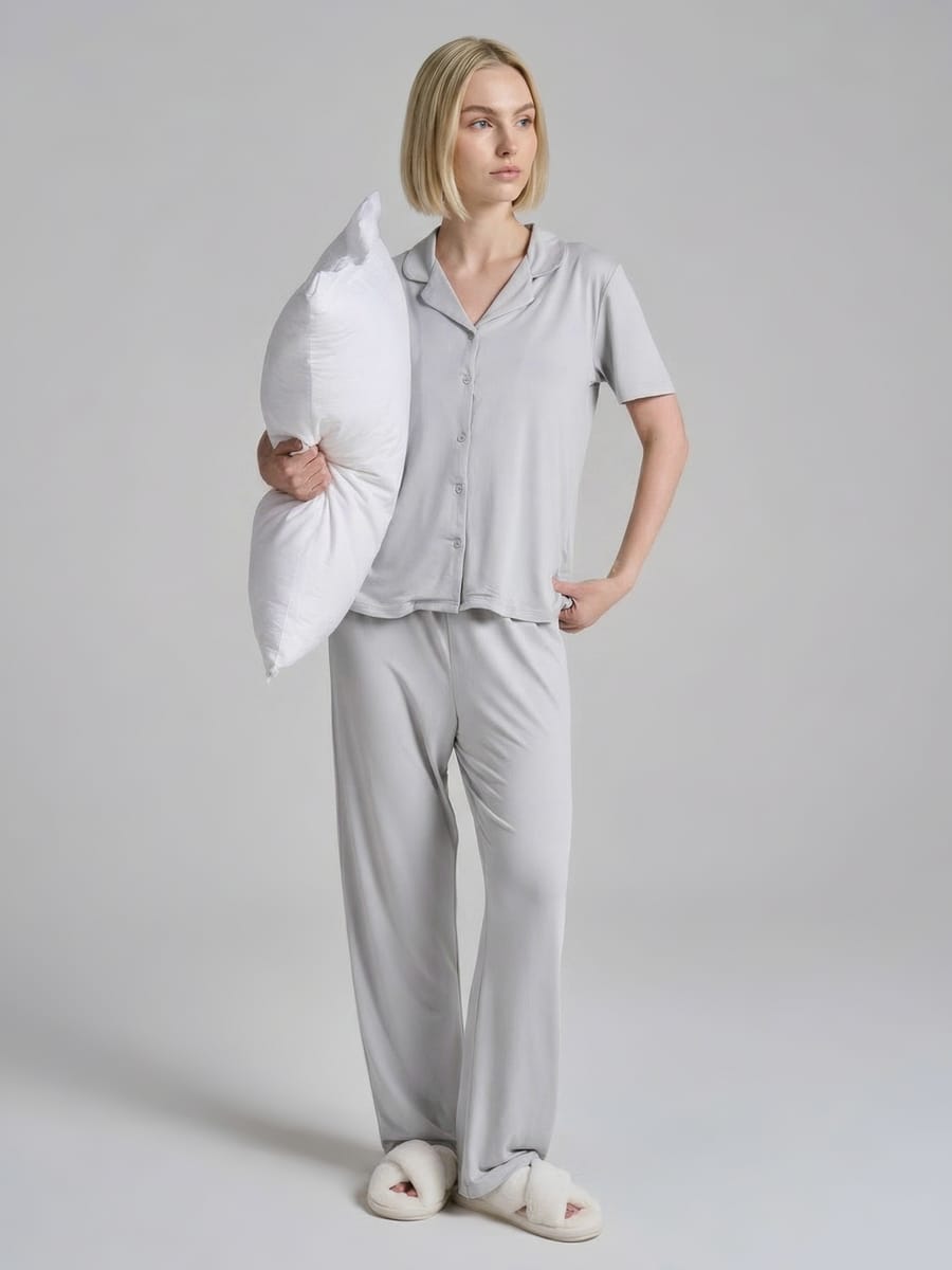 Женская пижама от бренда ТВОЕ — это гармония лаконичного стиля и непревзойдённого комфорта. Комплект‑двойка в благородном сером оттенке состоит из рубашки с отложным воротом и коротким рукавом и прямых брюк. Монохромная гамма придаёт модели изысканную сдержанность, позволяя ей легко вписаться в повседневный домашний гардероб.