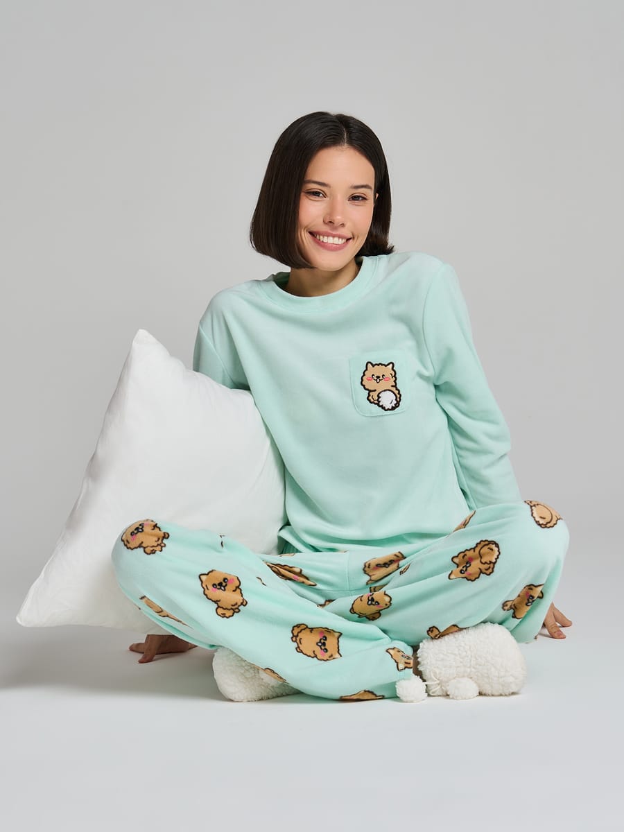 Окунитесь в мир нежности и комфорта с новой коллекцией пижам от бренда ТВОЕ! Представляем вашему вниманию очаровательную двойку с милыми изображениями корги, которая станет вашим любимым домашним нарядом в холодное время года. Нежная бирюзовая палитра гармонично сочетается с очаровательными изображениями любимых собак породы корги. Лонгслив украшен стильным патчем с изображением корги на нагрудном кармане, а прямые брюки дополнены милым принтом с этими очаровательными питомцами. Длинный рукав лонгслива обеспечивает дополнительное тепло и комфорт.