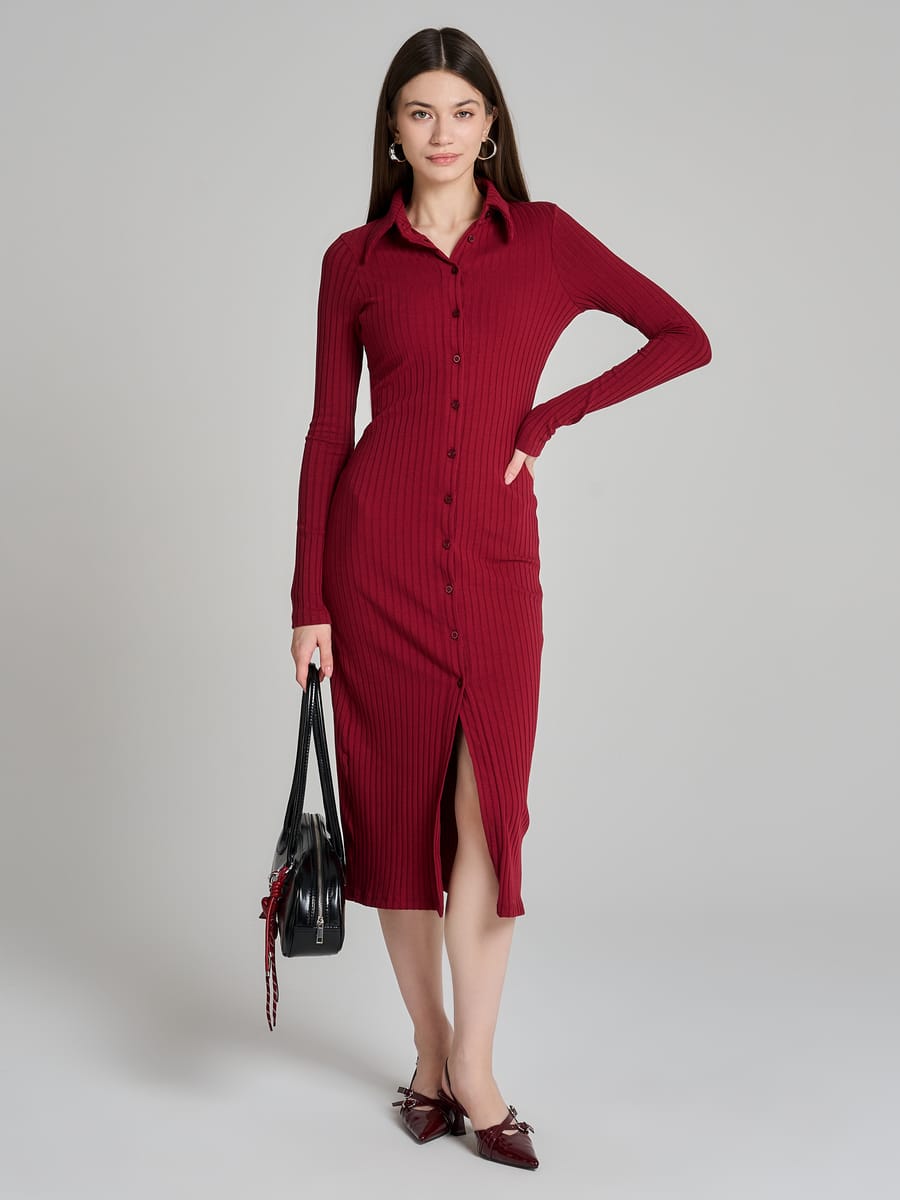 Изысканное бордовое платье-футляр от бренда ТВОЕ — воплощение элегантности и стиля в современной моде 2025 года! Элегантный приталенный силуэт и благородный оттенок создают роскошный образ для особых случаев. Дизайн платья продуман до мелочей: отложной воротничок добавляет строгости, а длинный рукав делает модель универсальной для любого сезона. Застёжка на пуговицах по всей длине позволяет регулировать глубину декольте и создаёт дополнительный акцент.