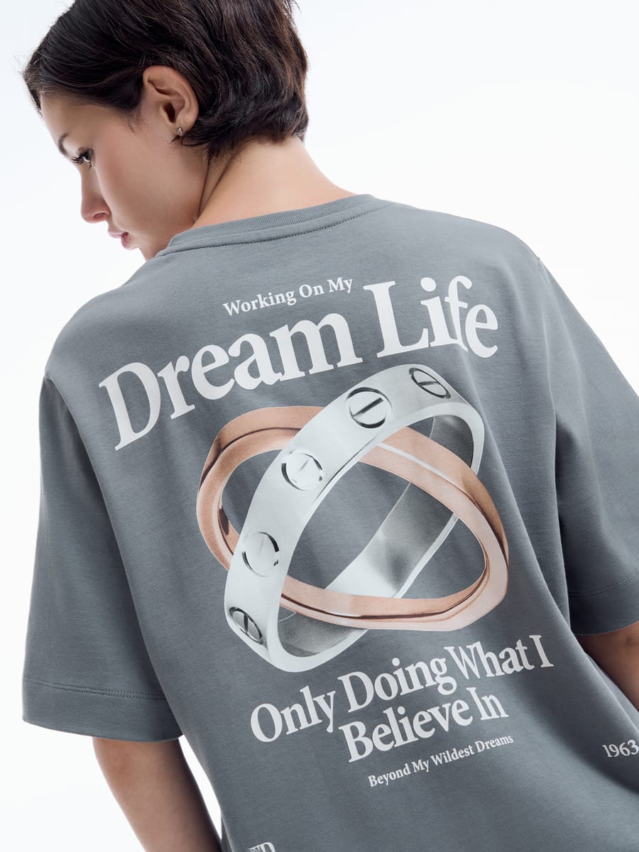Стильная футболка из 100% натурального хлопка с оригинальным дизайнлм со стилизованными кольцами и вдохновляющей надписью Dream the Life на спине в благородном сером цвете — must-have для современной девушки. Модель выполнена в популярном стиле оверсайз, который подчеркивает актуальные тренды 2025 года. 100% хлопок плотностью 280 г/м2 обеспечивает максимальный комфорт при носке
