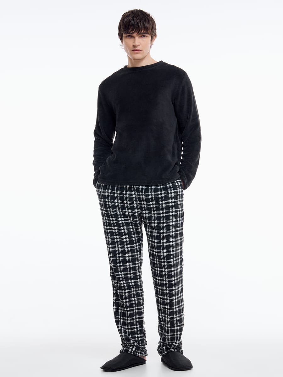 Теплая мужская пижама-двойка от бренда ТВОЕ — идеальное решение для комфортного домашнего отдыха в холодное время года.Черно-белый комплект в клетку создает стильный и уютный образ, который будет радовать своего владельца в холодное время года. Плюшевая ткань обеспечивает максимальное тепло и комфорт, а продуманный крой делает пижаму удобной для длительного ношения. Прямые брюки с карманами добавляют практичности и функциональности комплекту, делая его идеальным выбором для домашнего отдыха.