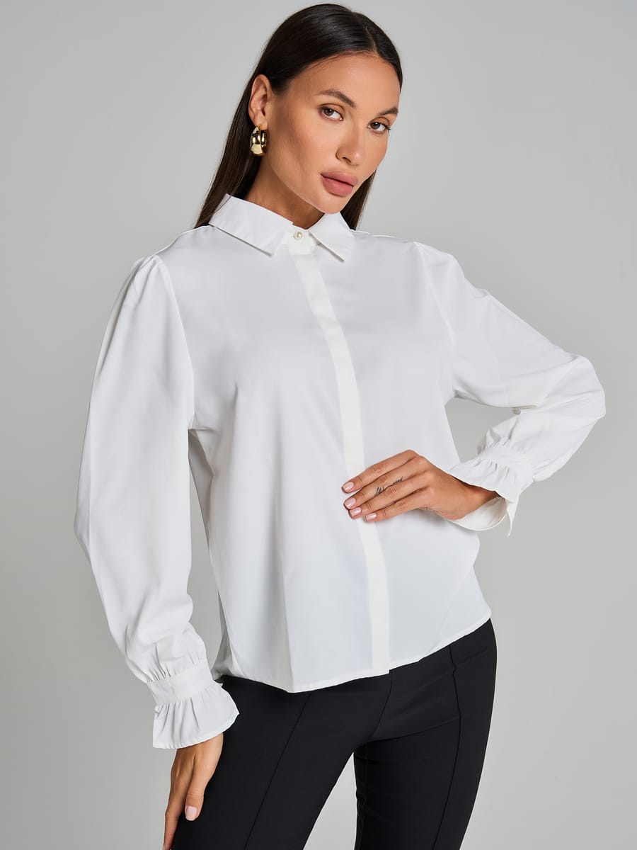 Элегантная женская рубашка от бренда ТВОЕ — воплощение стиля и комфорта для особых случаев и повседневной носки. Изысканная рубашка выполнена из высококачественного искусственного шёлка, который создаёт благородный блеск и приятные тактильные ощущения. Модель 2026 года сочетает в себе классический крой и современные детали: застежка супатная с элегантными пуговицами; отложной воротник добавляет образу утонченностиж длинные рукава с оригинальными манжетами на резинке, украшенными рюшами.