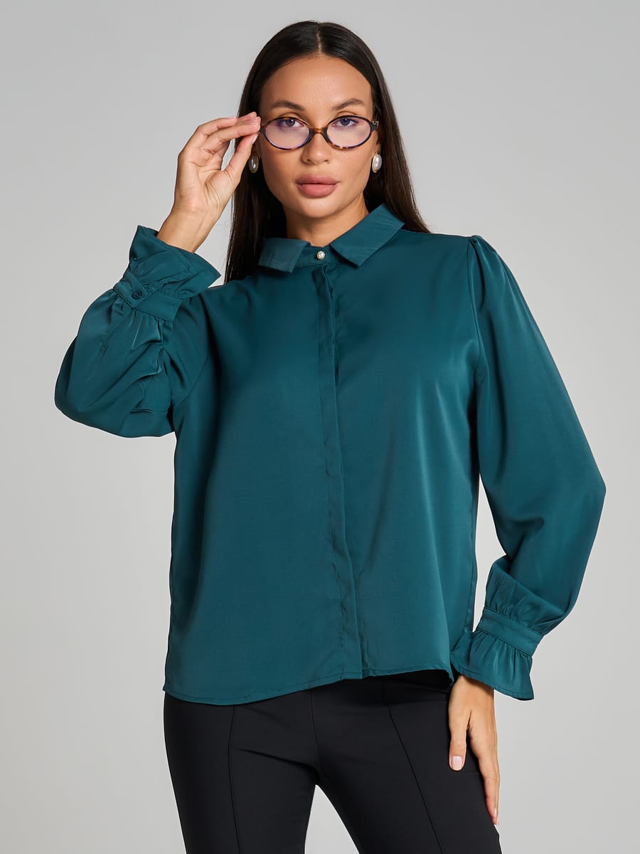 Элегантная женская рубашка от бренда ТВОЕ — воплощение стиля и комфорта для особых случаев и повседневной носки. Изысканная рубашка выполнена из высококачественного искусственного шёлка, который создаёт благородный блеск и приятные тактильные ощущения. Модель 2026 года сочетает в себе классический крой и современные детали: застежка супатная с элегантными пуговицами; отложной воротник добавляет образу утонченностиж длинные рукава с оригинальными манжетами на резинке, украшенными рюшами.