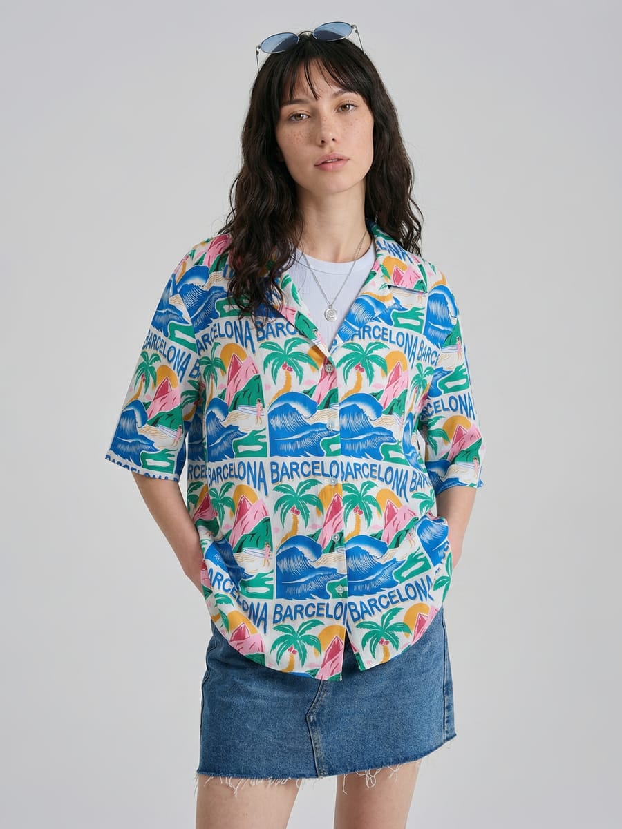 Короткий рукав делает модель по‑настоящему летней — в такой рубахе не будет жарко, а её силуэт остаётся аккуратным и стильным. Принт с элементами городского и природного пейзажа добавляет вещи индивидуальности: это не просто яркая гавайская рубашка, а своеобразный модный сувенир, который напоминает о мечтах о путешествиях.