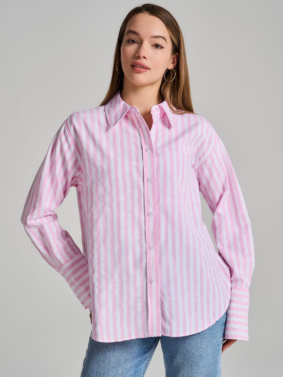 Женская рубашка от бренда ТВОЕ — это идеальное сочетание стиля и комфорта, созданное для подростков и женщин, которые ценят универсальность и элегантность в одежде. Выполненная в полоску, она изготовлена из плотной ткани, состоящей из 50% полиэстера и 50% хлопка, что обеспечивает долговечность и комфорт в носке. Оверсайз крой рубахи придает ей современный вид и свободу движений, а отсутствие карманов делает ее легкой и утонченной. Длинные рукава с манжетами на пуговицах добавляют изысканности и завершают аккуратный образ. Пуговицы на манжетах позволяют регулировать плотность посадки, добавляя практичности.