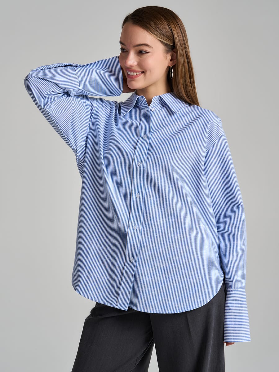 Женская рубашка от бренда ТВОЕ — это идеальное сочетание стиля и комфорта, созданное для подростков и женщин, которые ценят универсальность и элегантность в одежде. Выполненная в полоску, она изготовлена из плотной ткани, состоящей из 50% полиэстера и 50% хлопка, что обеспечивает долговечность и комфорт в носке. Оверсайз крой рубахи придает ей современный вид и свободу движений, а отсутствие карманов делает ее легкой и утонченной. Длинные рукава с манжетами на пуговицах добавляют изысканности и завершают аккуратный образ. Пуговицы на манжетах позволяют регулировать плотность посадки, добавляя практичности.