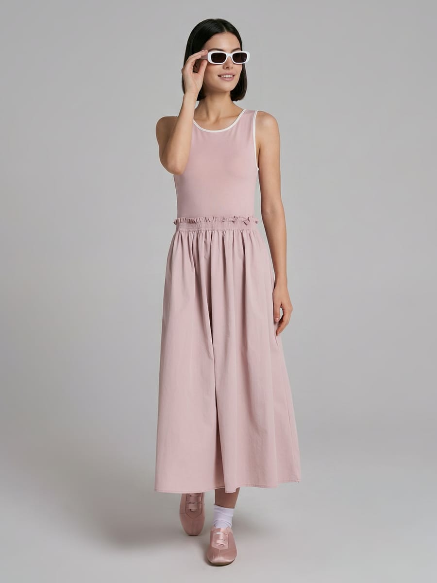 Лёгкий сарафан от бренда ТВОЕ — идеальный спутник для весенних и летних дней 2026 года. Модель миди умело сочетает в себе элегантность и непринуждённость, создавая образ, который одинаково хорошо смотрится и на пляже, и в городе. Дизайн платья продуман до мелочей: верхняя часть в рубчик имитирует топ и подчёркивает линию талии, а гладкая юбка добавляет силуэту плавности и динамики. Приталенный крой деликатно акцентирует фигуру, не сковывая движений, — благодаря юбке на резинке модель невероятно комфортна в носке. Широкие бретели обеспечивают надёжную посадку и добавляют образу лаконичности, а тонкая белая полоска на горловине служит изящным акцентом, ненавязчиво разбавляя однотонное полотно ткани. Рюши на поясе вносят в дизайн нотку романтичности: они мягко очерчивают талию и придают сарафану особое очарование.