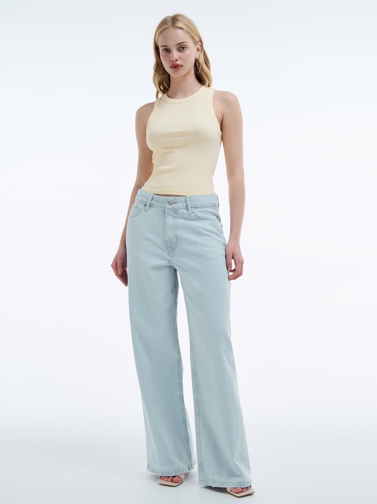 Стильные широкие джинсы с потёртостями на штанинах — идеальный выбор для тех, кто ценит комфорт и модный образ. Выполненные в голубом цвете с эффектом «варёнки», они придают образу уникальность и актуальность, идеально вписываясь в стиль Y2K.