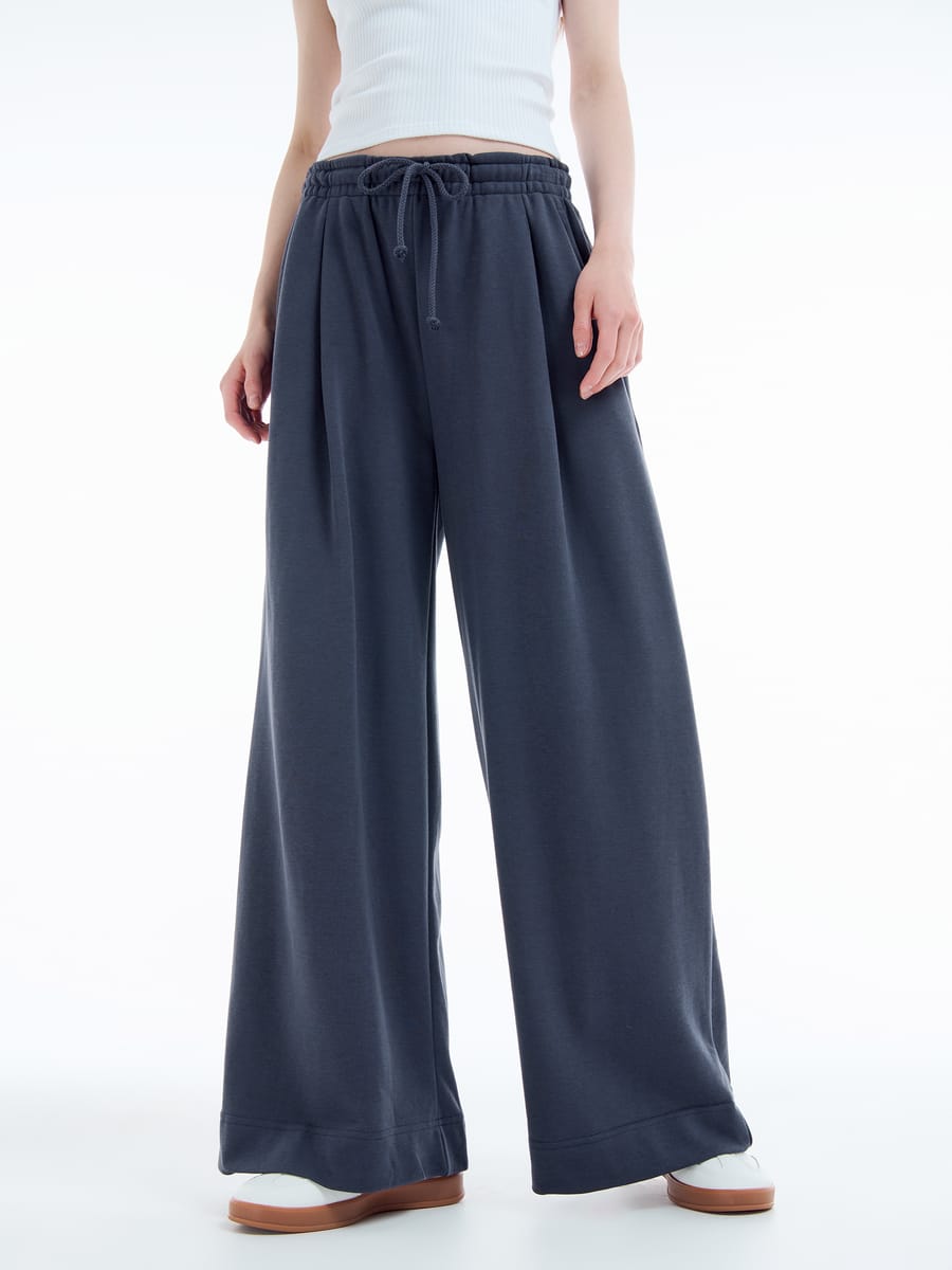Трендовые брюки-трико в темно-синем цвете выполнены в актуальном стиле оверсайз с завышенной талией, что делает её идеальным выбором для создания модных образов 2025 года. Штаны отличаются свободным силуэтом и удлинённым кроем. Широкая эластичная резинка с завязками обеспечивает комфортную посадку и надежную фиксацию на талии. Высокая посадка визуально удлиняет ноги и подчеркивает талию.