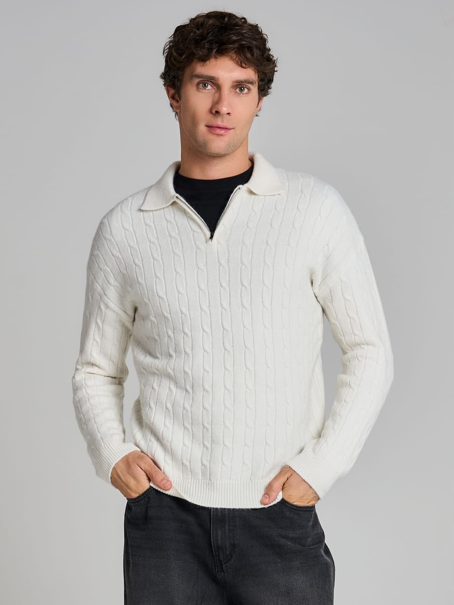 Элегантный мужской свитер от бренда ТВОЕ — идеальное сочетание классического стиля и современного комфорта. Модель свободного кроя с изысканным узором из кос создает благородный силуэт, актуальный для сезона 2025 года. Продуманный дизайн включает отложной воротник с практичной молнией-полузамком, что добавляет модели функциональности и позволяет регулировать глубину горловины. Длинные рукава обеспечивают дополнительную защиту от холода, а свободный крой гарантирует комфорт при носке.