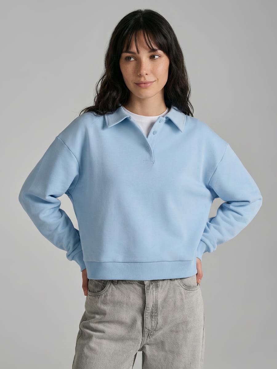 Женский свитшот от бренда ТВОЕ — трендовая модель 2026 года, которая виртуозно балансирует между деловым и повседневным стилем. Нежный голубой оттенок придаёт образу свежесть и лёгкость, а однотонное исполнение делает вещь универсальной: она легко впишется в самые разные ансамбли и станет надёжной базой гардероба для подростков и молодых женщин с любым типом фигуры — благодаря широкой размерной сетке. Оригинальный дизайн выделяет толстовку из ряда привычных моделей: отложной воротник с пуговицами добавляет нотку деловой строгости, ненавязчиво подчёркивая утончённость образа. Объёмный длинный рукав создаёт современный силуэт и при этом не сковывает движений, а прямой крой обеспечивает комфортную посадку — свитер выглядит стильно и непринуждённо, не добавляя лишних объёмов.