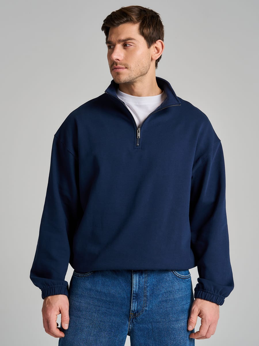 Мужской свитшот от бренда ТВОЕ — стильная и комфортная вещь, которая органично впишется в гардероб современного человека. Глубокий тёмно‑синий оттенок придаёт модели сдержанную элегантность, а однотонное исполнение делает её универсальной базой для самых разных образов. Модель выполнена из качественного футера трёхнитки — плотного, приятного к телу трикотажа из 100 % хлопка. Материал отлично сохраняет тепло, дышит и служит долго, что особенно ценно в осенне‑зимний сезон. Свободный оверсайз‑крой обеспечивает комфортную посадку и не сковывает движений, подчёркивая актуальные тенденции стиля Y2K и при этом оставаясь уместной в повседневном, офисном или школьном гардеробе. Особенность дизайна — воротник‑стойка с полузамком на молнии (half zip): это не только стильный акцент, но и практичная деталь, позволяющая регулировать степень открытости горловины. Длинные рукава завершают лаконичный силуэт, а продуманная конструкция делает толстовку удобной для многослойных комбинаций.