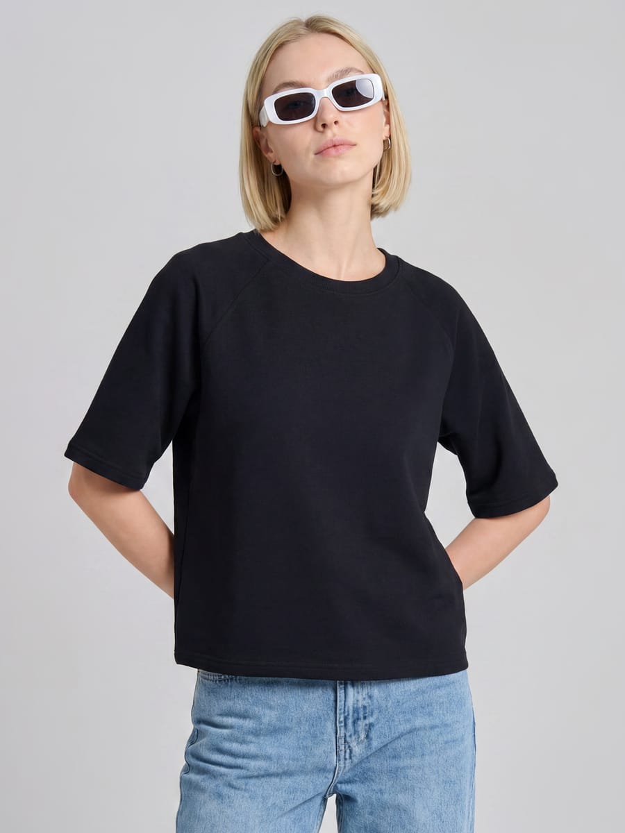 Женский свитшот от ТВОЕ 2026 — стильная однотонная модель свободного кроя для весны и лета. Выполнен из плотного трикотажа джерси без начёса, с широким круглым вырезом и коротким рукавом реглан. Подходит для офиса и повседневной носки, представлен в большой размерной сетке — идеальный выбор для девушек и подростков!