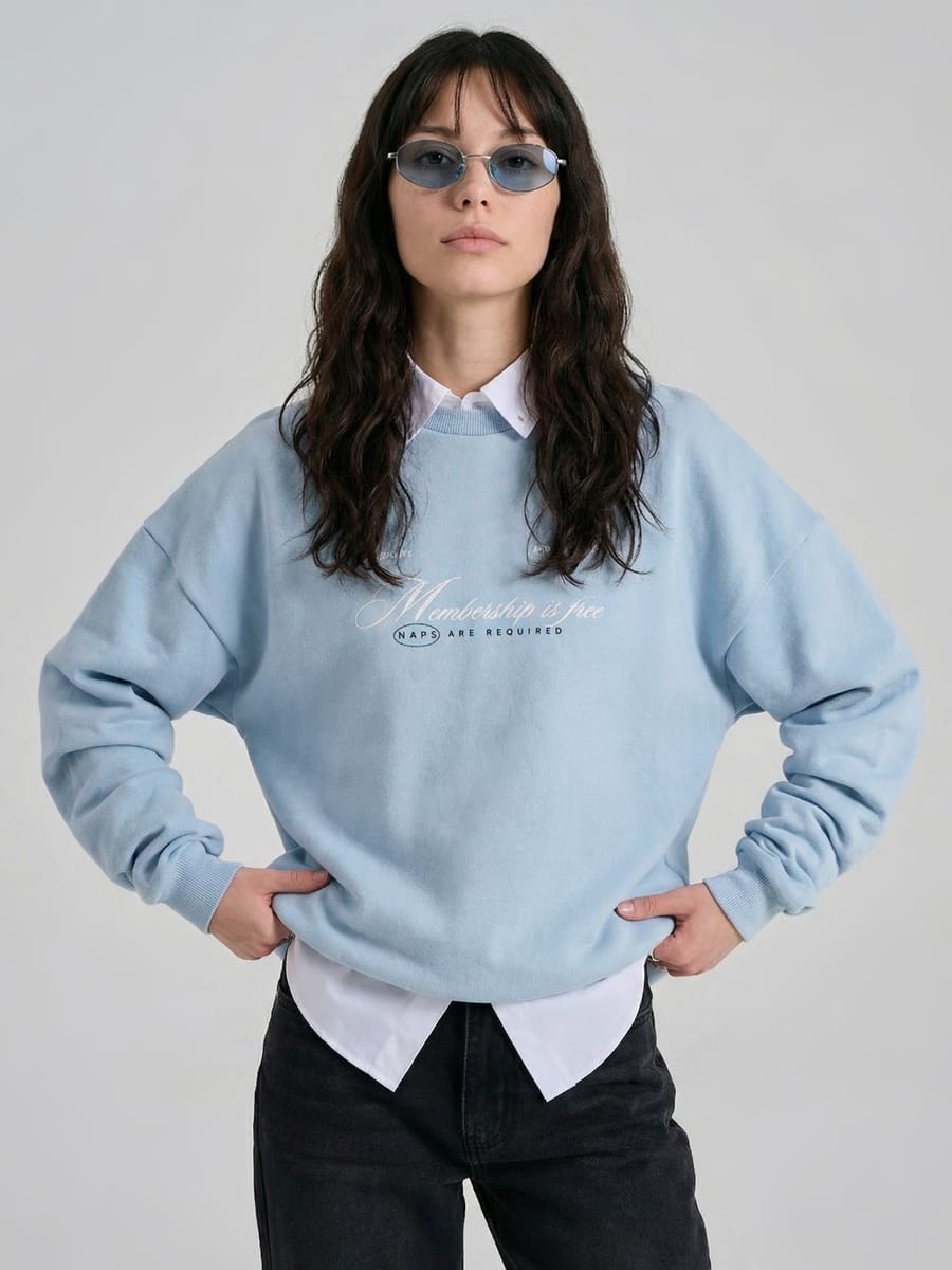 Женский свитшот от бренда ТВОЕ — яркая модель 2026 года для тех, кто любит выражать своё настроение через одежду. Нежно‑голубой оттенок создаёт лёгкое весеннее настроение, а броская надпись Membership is free добавляет образу иронии и индивидуальности — такая деталь точно не останется незамеченной и станет поводом для улыбок и разговоров.