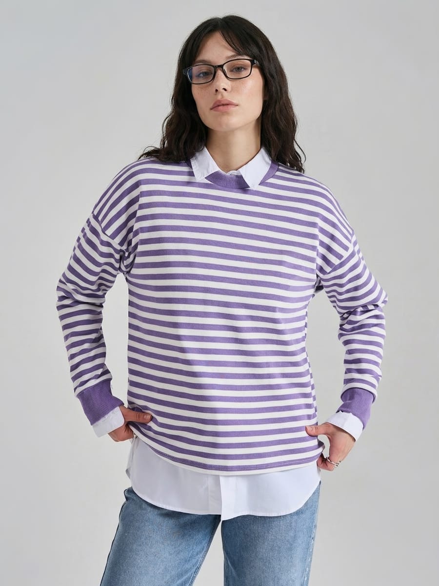 Женский свитшот от бренда ТВОЕ — стильная модель 2026 года, которая задаёт тон весеннему гардеробу. Полосатый узор в фиолетово‑бежевых тонах смотрится одновременно уютно и актуально: мягкие природные оттенки создают ощущение тепла и комфорта, а ритмичный рисунок добавляет динамики силуэту, делая образ более выразительным.