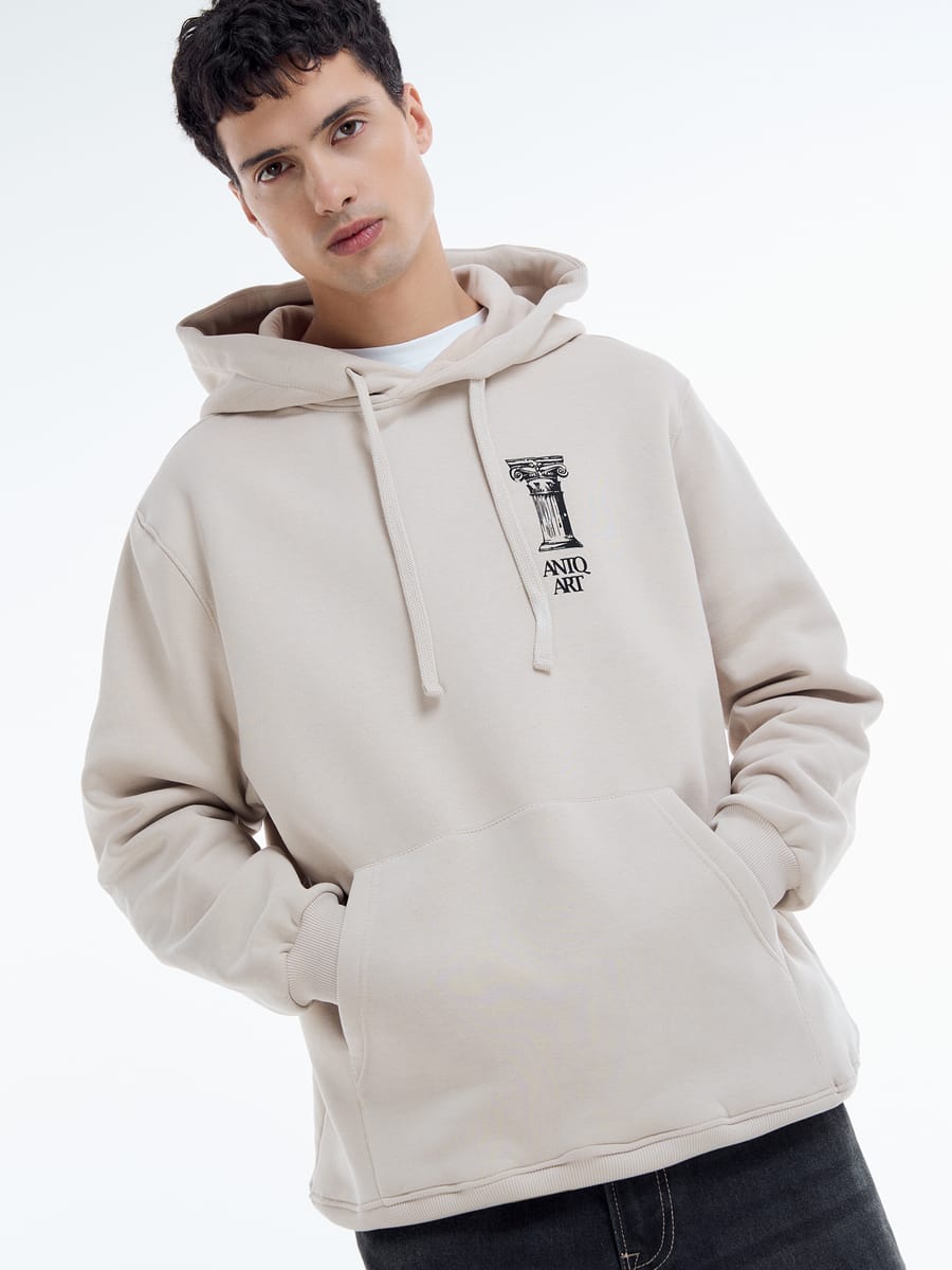 Стильное худи от российского бренда ТВОЕ — идеальное сочетание комфорта и современного дизайна. Модель выполнена в благородном светло-сером оттенке и украшена уникальным принтом в виде античной колонны, что придает изделию особый шарм.