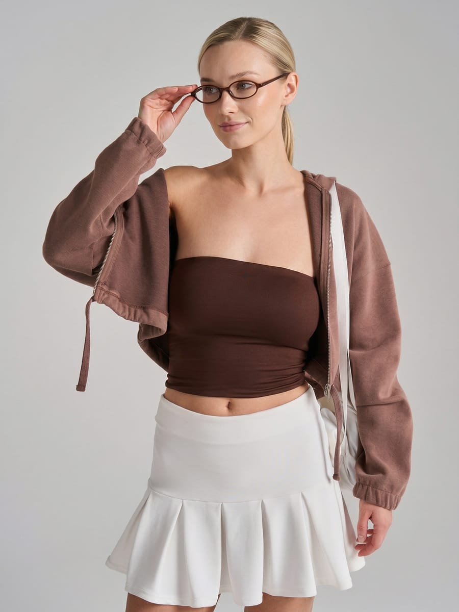 Женский топ бандо от бренда ТВОЕ — модная модель 2026 года, которая виртуозно балансирует между спортивными нотками и утончённым стилем. Укороченный приталенный силуэт элегантно подчёркивает линию талии, а облегающий крой выгодно выделяет контуры фигуры. Дизайн без лямок и с открытыми плечами придаёт модели лёгкую игривость и летнее настроение, при этом эластичность ткани обеспечивает комфорт и свободу движений — топ не сковывает даже во время тренировок.