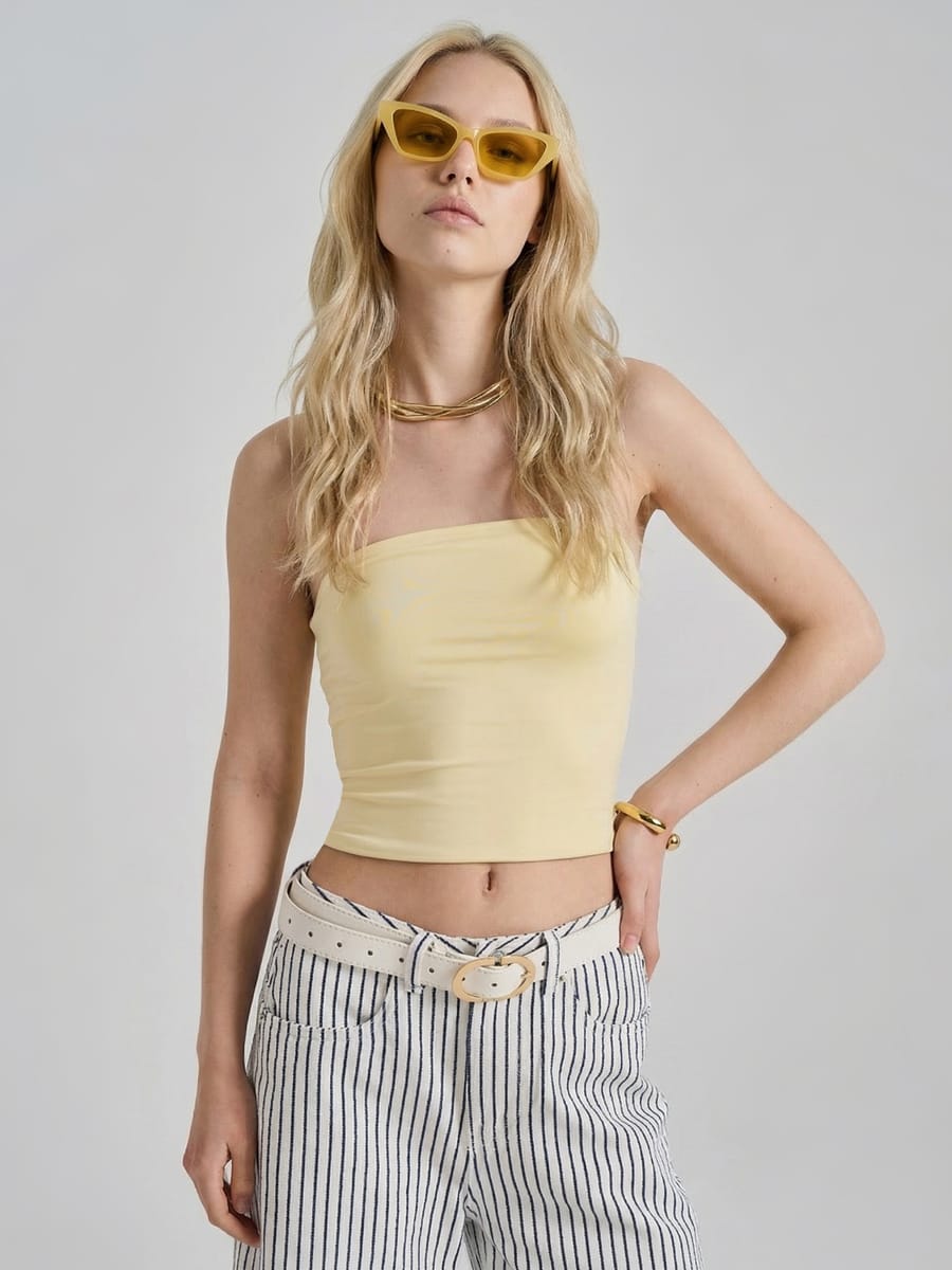 Женский топ бандо от бренда ТВОЕ — модная модель 2026 года, которая виртуозно балансирует между спортивными нотками и утончённым стилем. Укороченный приталенный силуэт элегантно подчёркивает линию талии, а облегающий крой выгодно выделяет контуры фигуры. Дизайн без лямок и с открытыми плечами придаёт модели лёгкую игривость и летнее настроение, при этом эластичность ткани обеспечивает комфорт и свободу движений — топ не сковывает даже во время тренировок.