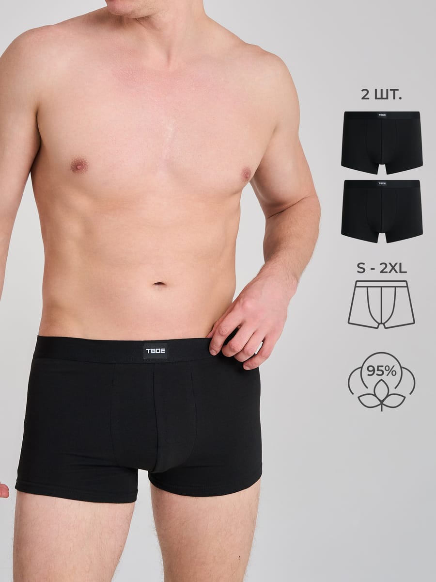 Набор мужских боксеров от ТВОЕ: 2 шт., чёрный цвет. Изготовлены из дышащего материала (95% хлопок, 5% эластан) с широкой удобной резинкой. Однотонные, стильные и комфортные — идеально подходят для лета, занятий спортом и повседневной носки. Отличный подарочный комплект для подростков и мужчин!
