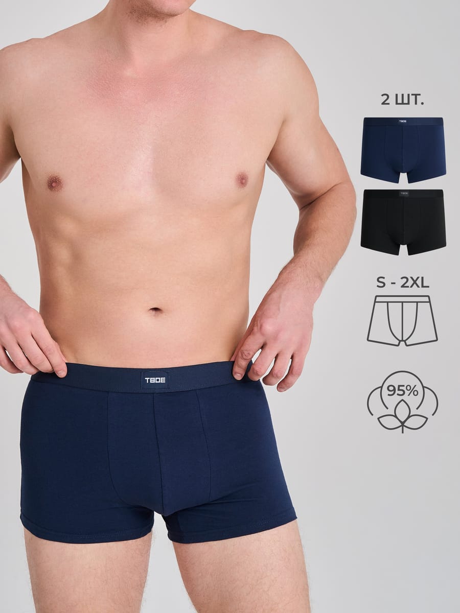Набор мужских боксеров от ТВОЕ: 2 шт. (синий и чёрный). Выполнены из дышащего материала (95% хлопок, 5% эластан), с широкой удобной резинкой. Однотонные, стильные и комфортные — идеально для спорта, повседневной носки и лета. Отличный подарочный комплект для подростков и мужчин!