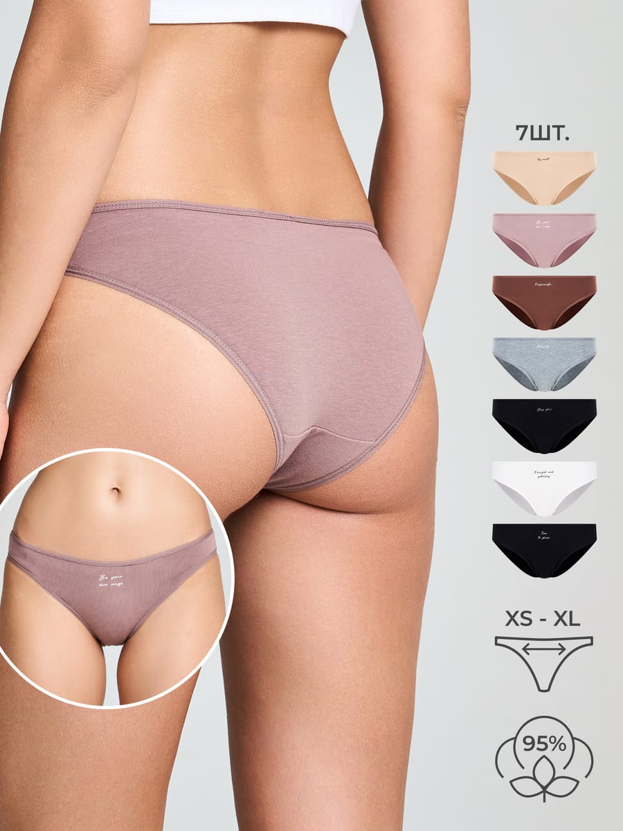 Натуральный состав из 95% хлопка и 5% эластана обеспечивает максимальный комфорт при носке. Семь штук в наборе позволяют выбрать модель под настроение, каждая из которых украшена вдохновляющими надписями. Мотивационные надписи («Be your own mege», «Fashionista», «Stunning» и др.) добавляют особый шарм и поднимают настроение. Однотонные базовые цвета делают модели универсальными для любого гардероба.