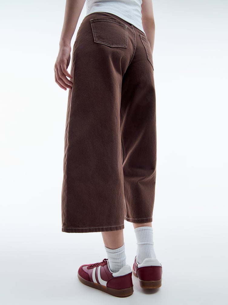 Брюки кюлоты изготовленны из 100% натурального хлопка, брюки дарят непревзойденный комфорт и приятные тактильные ощущения. Благородный коричневый цвет и плотная ткань делают их идеальным выбором для создания стильных образов в весенне-летний сезон. Модель с высокой посадкой идеально подчеркивает фигуру, создавая изящный силуэт. Удобные прорезные карманы спереди и функциональные накладные карманы сзади добавляют практичности, а надежная застежка на молнии и пуговице обеспечивает идеальную посадку и комфорт при носке.