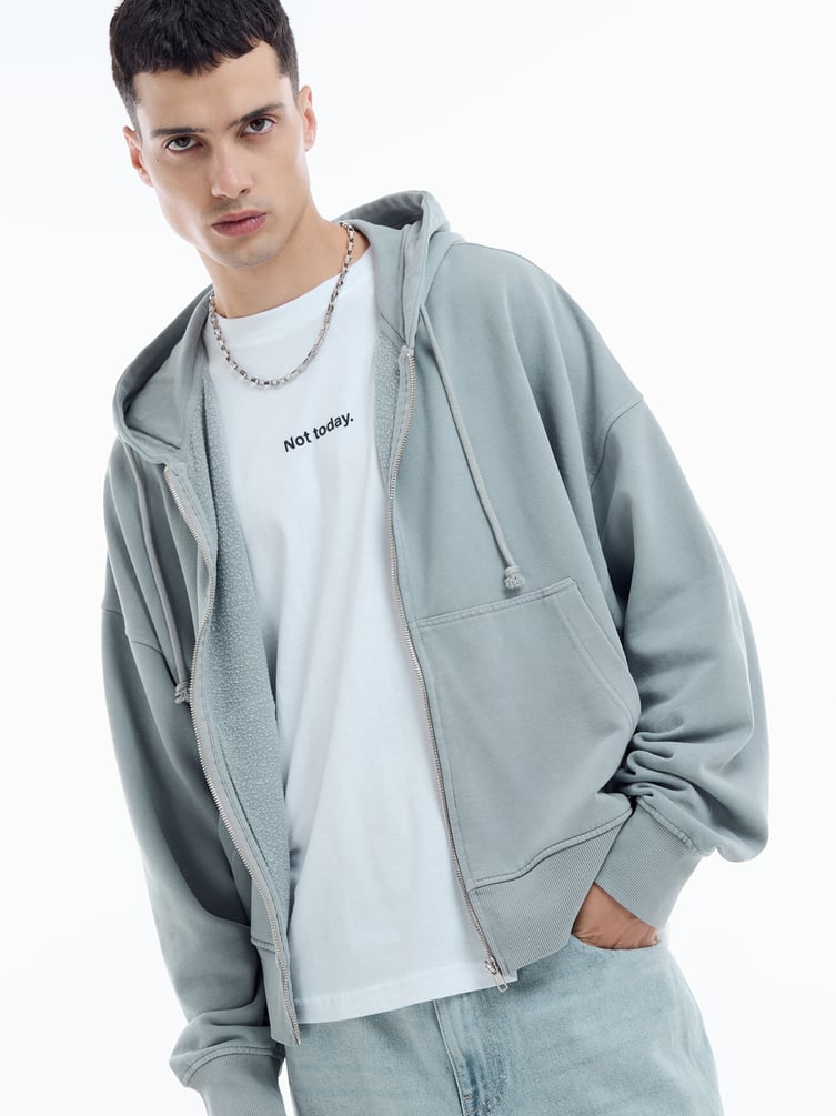 Стильная мужская толстовка в трендовом светло-сером цвете с эффектом вареного денима – воплощение комфорта и универсальности в современном стиле. Модель идеально сочетает в себе практичность и модный дизайн.